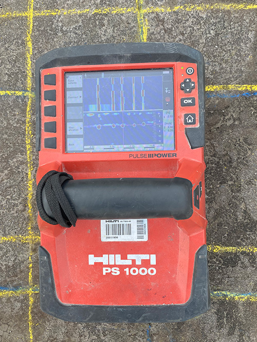 Using the Hilti PS 1000 Ground Penetrating Radar Scanning System our team will come to your job-site and reveal the exact location of concealed rebars, tendons, metal and plastic conduits, glass-fiber cables, voids and wood in dry concrete structures at depths of up to 300 mm.